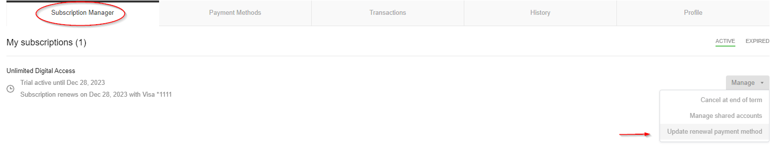 - Select Update Renewal Payment Method.