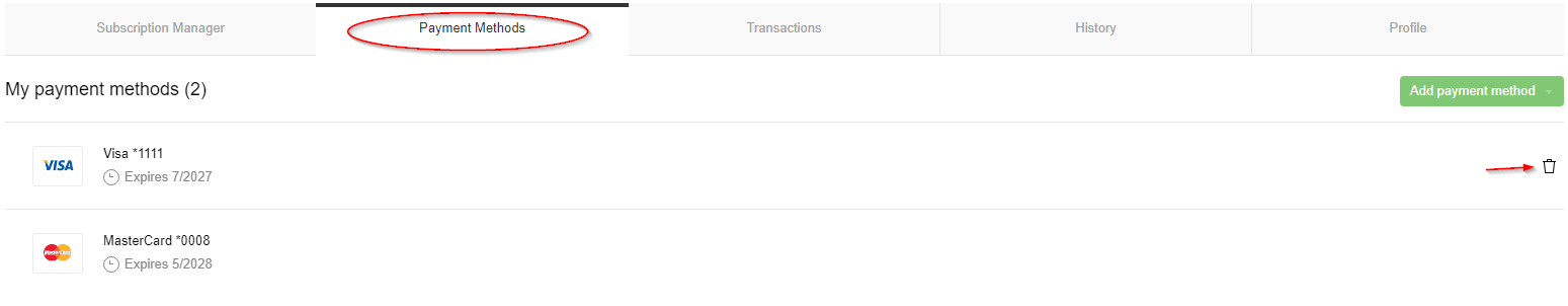 To remove an old method of payment once the new payment option has been added, go back to the Payment Methods tab and, on the far righ,t click/tap on the trash can icon on the same line as the payment method that you wish to remove.