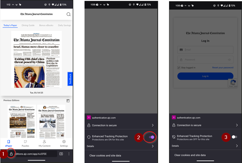 If you are using Firefox on your mobile device and find that you are unable to log in (the log in screen either never appears or is greyed out), please verify if you have Enhanced Tracking Protection set to "Strict" in your Firefox browser settings. If set to Strict, this will interfere with the log in functionality. To bypass it, you will need to add an exception for ajc.com. To do this, tap on the lock icon in the URL address bar. That opens the security setting. Tap on Enhanced Tracking Protection to toggle it off for ajc.com only. Once toggled off, the login screen will appear and you can log in as normal.