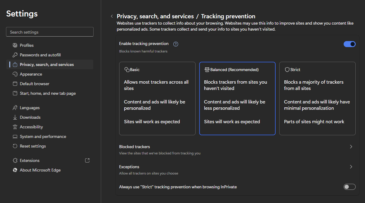 Click on Tracking Prevention (the first item in the list) and change the setting from Strict to Balanced.